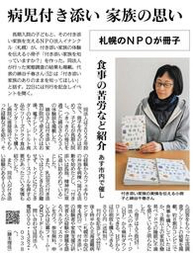 札幌市で付き添い入院家族の支援を行うNPO法人「イナンクル」の綿谷千春代表とは、全国紙に載った綿谷代表の記事を読んで2022年のコンクールで入賞して以降、親交があった。記事について連絡すると綿谷代表は「制度化は喜ばしいが望まないルールができるかもしれない」という意見と共に同法人発行の小冊子を取り上げた2月21日付道新の記事「病児付き添い 家族の思い」=写真=を送ってくれた。