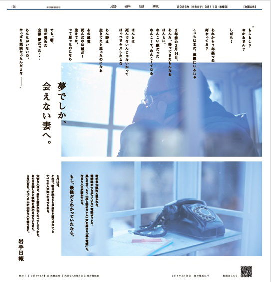 ![]() 今年の別刷り広告に再掲された18年の広告紙面「大切な人を想う日 風の電話篇」 |